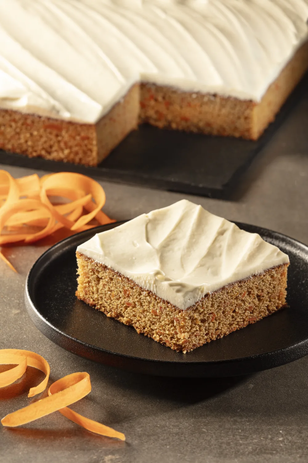 Lightly spiced cake filled with raisins and shredded carrots, topped with icing.