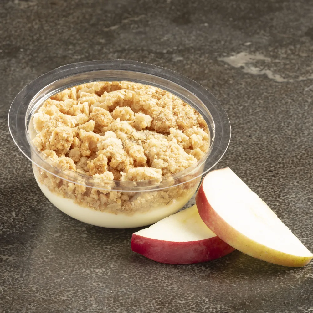 Apple topping, light apple cream, topped with crumble.