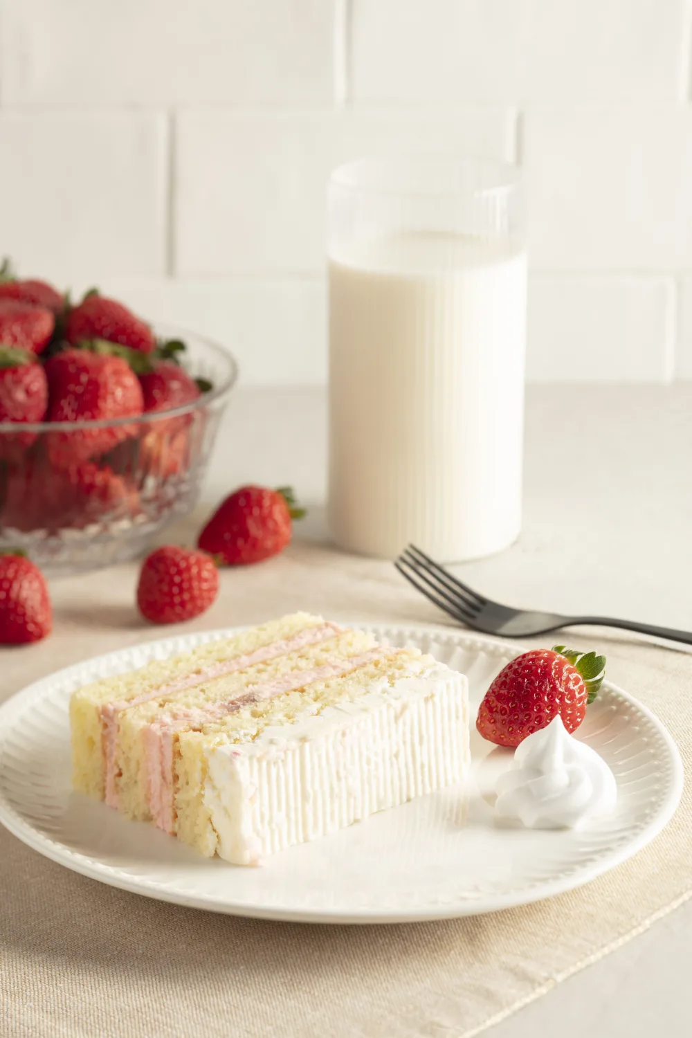 Three vanilla cake layered with whipped strawberry cream topped with pieces of strawberries, whipped vanilla cream and vanilla butter cream.