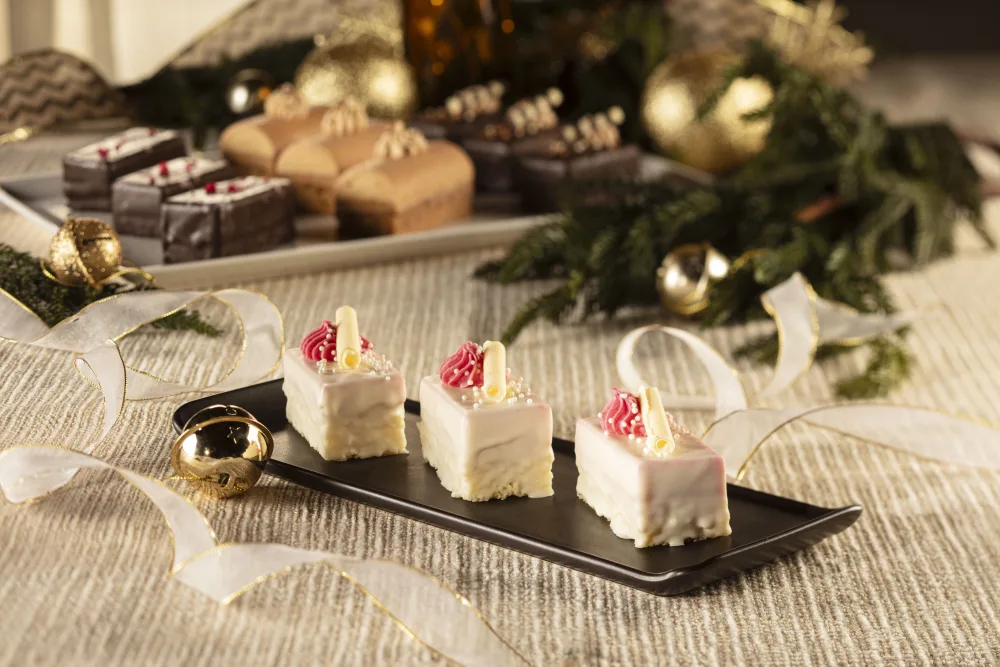 Pâte à la vanille surmontée d’un croquant au chocolat blanc et d’une crème aux canneberges. Le tout enrobé d’un glaçage au chocolat blanc puis d’une rosette de crème aux canneberges.